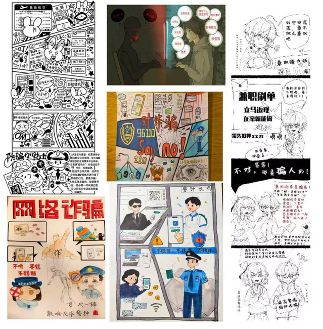 活动前期,学院积极动员,学生踊跃参与,共征集到标语、海报等作品30余件。同学们充分发挥创意,巧妙构思,通过绘漫画或者手绘等形式进行创作,以色彩斑斓、富有创意的作品,鲜明呈现网络诈骗的典型场景、诈骗分子的犯罪手段,以通俗易懂的方式宣传防范电信诈骗知识,描绘电信诈骗的危害,阐明电信诈骗的种类,表达防范电信诈骗的重要性,使反诈知识以直观呈现中深入人心,实现了“全民反诈”理念在校园中的生动传播。同学们在创作与分享中,自觉成为反诈知识的传播者和践行者。