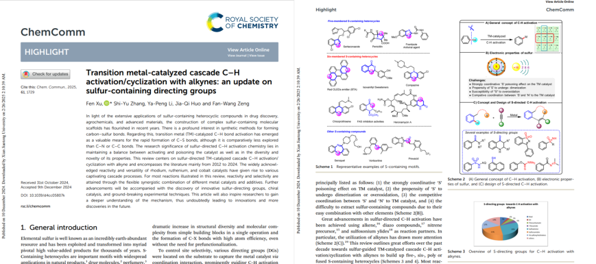 鉴于含硫杂环化合物在药物研发、农用化学品和先进材料中的广泛应用,近年来复杂含硫分子骨架的构建蓬勃发展。论文综述聚焦硫导向过渡金属催化炔烃参与的串联C-H键活化/环化反应。通过不同金属催化剂与添加剂的灵活协同组合,实现了高效的反应活性与选择性。本文将启发研究者深入探索反应机理,为该领域的进一步发展奠定基础。研究成果以“Transition metal-catalyzed cascade C–H activation/cyclization with alkynes: an update on sulfur-containing directing groups”为题发表在国际学术期刊《chemical Communications》上。除导师外,论文作者:2022级本科生张诗雨、李亚鹏、霍佳琪、曾凡望。