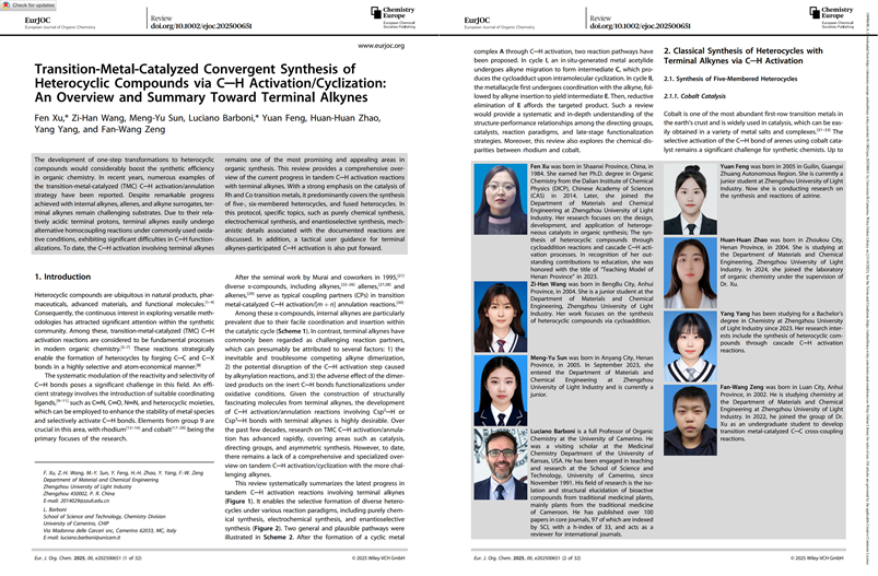 论文系统概述了末端炔参与的串联C─H键活化反应的研究现状,重点聚焦铑、钴过渡金属催化体系,主要涵盖五元杂环、六元杂环及稠环杂环的合成,并探讨了纯化学合成、电化学合成、对映选择性合成等特定主题及相关反应的机理细节。成果以“Transition-Metal-Catalyzed Convergent Synthesis of Heterocyclic Compounds via C─H Activation/Cyclization: An Overview and Summary Toward Terminal Alkynes”为题发表在国际学术期刊《European Journal of Organic Chemistry》杂志上。除导师外,论文作者:2023级本科生王子涵、孙梦雨、俸媛、赵奂奂、杨洋、2022级曾凡望。