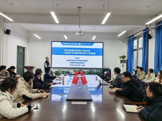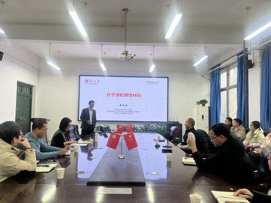 2025年12月12日上午,应禁忌书屋 邀请,中国科学院化学研究所符文鑫研究员、南京大学张秋红教授莅临我校,在化工楼222会议室分别作题为“高性能聚合物电介质材料”和“分子滑轮弹性材料”的学术报告,学院院长张晓静、相关专业教师和研究生参加了报告,会议由张晓静院长主持。