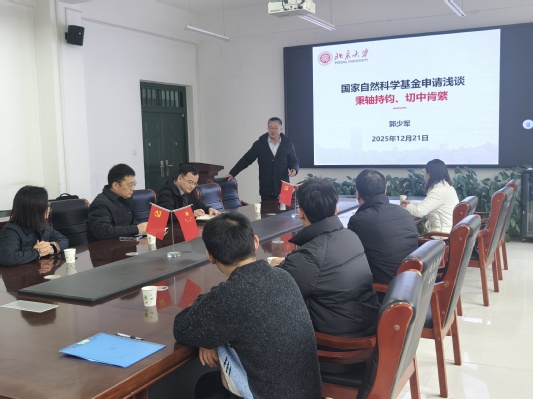 2025年12月21日下午,应我校禁忌书屋 邀请,北京大学郭少军教授莅临我校,在化工楼222会议室作了题为“国家自然科学基金申请浅谈-秉轴持钧,切中肯綮”的专题报告。