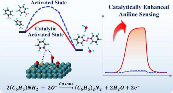 该研究聚焦传统金属氧化物(MOS)传感器研发过度依赖经验式的“试错法”,以及对气敏机理研究不透彻的问题,通过采用顶空采样气相色谱-质谱联用(HS-GC-MS)技术,实现了对苯胺蒸气在金属氧化物表面化学反应过程的动态捕捉与定量分析,证实了苯胺蒸气分子在Cu掺杂的SnO2纳米颗粒(Cu-SnO2)表面发生了向偶氮苯转化的特定催化氧化反应,从而揭示了气敏增强机制是Cu离子对苯胺生成偶氮苯的催化效应所致,并首次定量揭示了该气敏反应属于二级催化反应动力学,并拟合出该二级催化反应的速率常数(k)。进一步的研究发现苯胺的氧化速率与传感器的响应性能之间存在显著的正相关性。利用这种动力学数据与传感性能的定量耦合,本工作理性优化掺杂Cu离子浓度,制备出对苯胺气敏性能最佳的Cu-SnO2气体传感器。该研究通过引入分析化学领域的定量手段,跨学科地解决了气敏机制难以量化描述的难题,为金属氧化物气敏材料的机理研究提高了一种有效的研究手段。